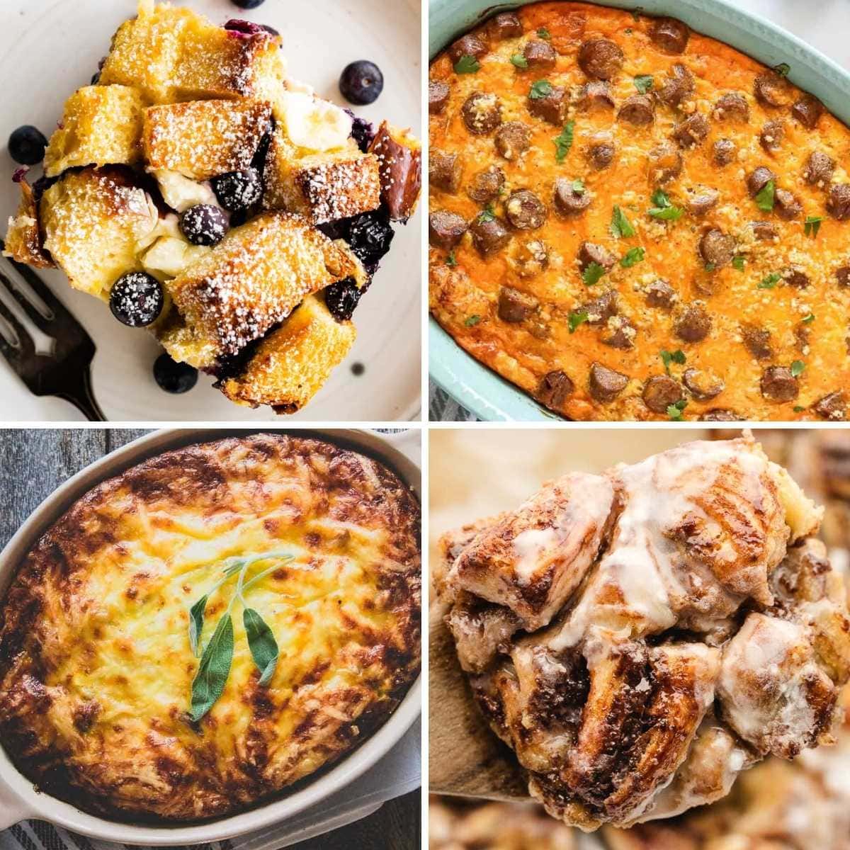 Four casserole images: blueberry toast, sausage, cheesy potato, and cinnamon roll.